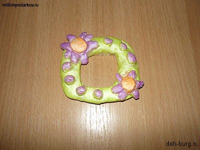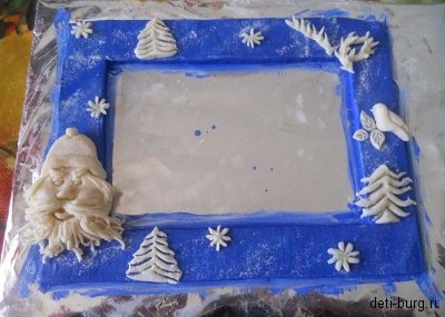 Основа для рамки готова, теперь мы ее будем украшать! Для этого из теста лепим цветочки, листики, фигурки животных, т.е. все что умеете, и что придет в голову. Если лепить не умеете, узор можно нарисовать ножом или выложить бусинами, семечками, косточками (смотрите эту статью).