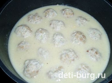 Заливаем фрикадельки белым соусом и тушим на медленном огне полчаса.