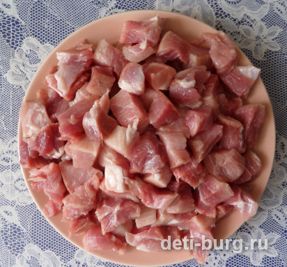 Сначала замаринуем мясо, для этого нарезаем свинину на небольшие кусочки и солим. Хорошо перемешаем.