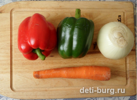 В это время подготовим овощи, нам понадобится сладкий перец, морковь и лук.