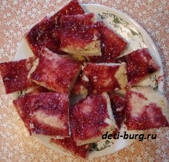 Когда тесто подрумяниться, достаем его из духовку, нарезаем пласт на квадраты. Готовое домашнее печенье перекладываем на блюдо. На горячем листе не оставляйте! Приятного чаепития!