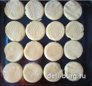 Размягченное сливочное масло взбить с сахаром, постепенно добавляя желтки и соль. В последнюю очередь добавляем муку и хорошо вымешиваем. Готовое тесто раскатываем в пласт толщиной 5- 7 мм и формочками или стаканом вырезаем лепешки и выкладываем их на противень. Для выпекания песочного теста противень ничем смазывать не нужно. Сверху заготовки мажем яйцом и вилкой рисуем волнистые полоски.