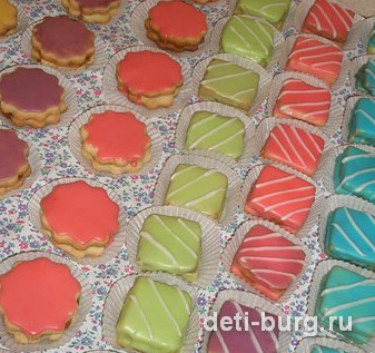 Песочное пирожное можно украсить и глазурью. Рецепт глазури: 1 белок взбить миксером с 200 г. сахарной пудры и 1 ч.л. лимонного сока. Если Вы добавите в глазурь пищевой краситель, то у Вас получаться вот такое веселое песочное пирожное!