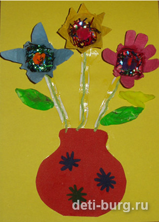 Добрый день, друзья! Сегодня хочу рассказать Вам, как сделать простую в исполнении, но оригинальную и красивую аппликацию «Цветы в вазе». Аппликация «Цветы в вазе» подойдет в качестве подарка для мамы ли бабушки на День Рождения или на 8 Марта. С ней смогут самостоятельно справиться детки в возрасте 5-7 лет.