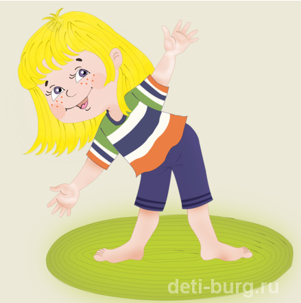 Малыш стоит, расставив ноги на ширине плеч. Разводит руки в стороны, как крылья у самолета и совершает наклоны в стороны. При этом руки делают большие махи.
