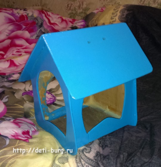 Склеивает эпоксидный клей быстро, поэтому через час уже можно приступать к покраске кормушки, что мы и сделали. Но предварительно надо просверлить отверстия под веревку, за которую вы будете подвешивать кормушку. Мы решили сделать четыре отверстия и привязали две веревочки, чтобы кормушка меньше раскачивалась от ветра.
