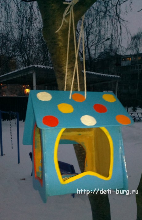 Когда краска высохла, осталось покрыть готовую кормушку для птиц лаком и повесить на дерево во дворе.