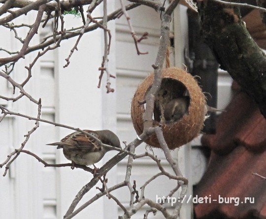 Какие вы молодцы! Кормушка в горошек такая веселенькая получилась! А кормушку из кокоса мы тоже хотим сделать - только вчера о такой читали в книжке "Проделки Финдуса". А пока мы просто подкармливаем птичек хлебом и семечками.