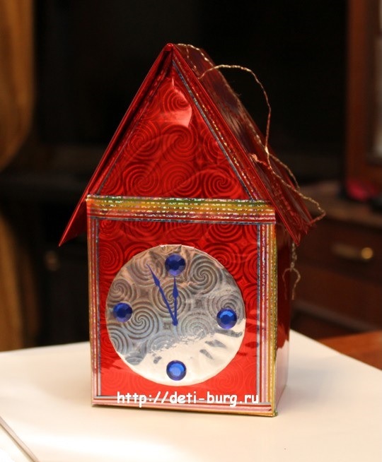 Как я уже писала выше, посмотрев на часы, я решила, что крыша должна быть другой и сделала из картона крышу. Закрепила крышу на домике при помощи двухстороннего скотча.