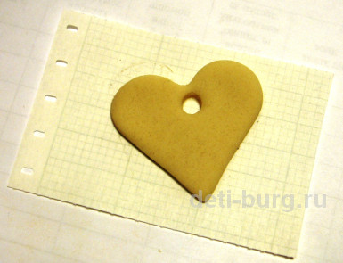 Кулон из соленого тестаДля самых маленьких скульпторов можно предложить сделать кулон для мамы или бабушки. Для его изготовления Вам понадобиться тесто, дощечка или фанерка. Помогите малышу раскатать скалкой кусочек теста на дощечке, а теперь пусть ребенок с помощью формочек для печенья (рыбки, звездочки, сердечки) выдавит нужную фигурку. Кулон можно украсить, например, бисером или бусинками. Также подойдут различные крупы, чем младше ребенок, тем крупнее нужно брать крупу (например, горох или фасоль). Проделываем дырочку для шнурка, и наш кулон готов!