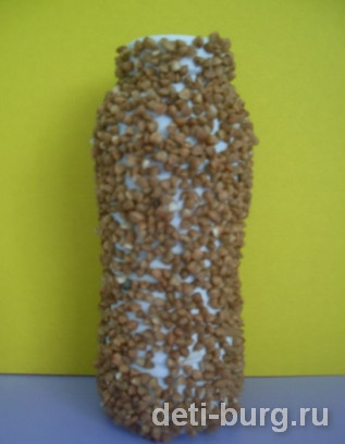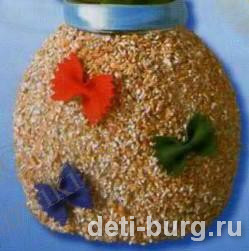 Можно сделать замечательную вазу или просто стаканчик для карандашей. Для этого намазываем пластилин на баночку или стаканчик. Можно оставить так, а можно сверху украсить рисунком из крупы. На прогулке соберите букет и поставьте в вашу вазу. Ну а если на улице зима, не беда. Возьмите веточку, дома слепите разноцветные шарики и украсьте ими ветку.