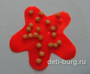 Усложняем задачу ребенку, на вылепленную фигурку налепляем зернышки крупы. Насыпьте крупу в тарелочку и предложите малышу по одному зернышку брать и прилеплять, начать можно с фасоли и гороха, а потом перейти на гречку, рис или бусинки. Главное следите, чтобы все эти замечательные предметы отправлялись в пластилин, а не в рот.