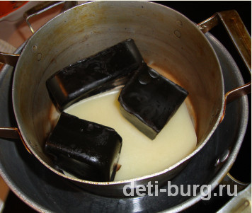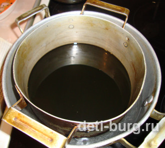 Донышки у кастрюль не должны соприкасаться, если они соприкасаются, то на дно большей кастрюли можно положить деревянную дощечку или сложенную в несколько слоев ткань. Делаем мы это для того, чтобы парафин не пригорел. Также следите, чтобы вода не попала на парафин. Нагреваем до получения однородной смеси, у меня на это ушло 30 минут (вода при этом даже не закипела).
