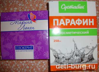 Я приобрела парафин и озокерит в упаковках по 250 г. В Интернете видела отзывы, о том что лучше не брать озокерит косметический, будто он сильно мажется и т.д. Я такой не нашла, поэтому купила косметический и все у меня получилось прекрасно, он чуть чуть мажет, но это не страшно!